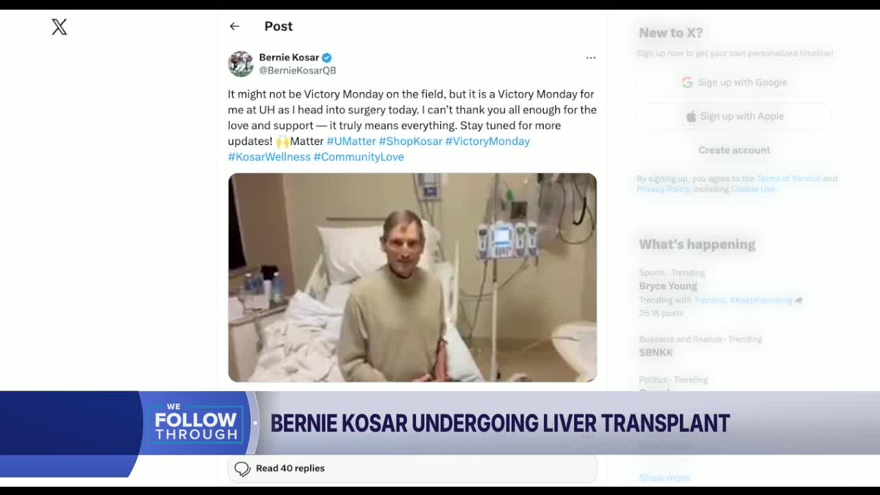 Former Browns QB Bernie Kosar shared some good news about his health, stating that he was undergoing surgery on Monday morning for a liver transplant.