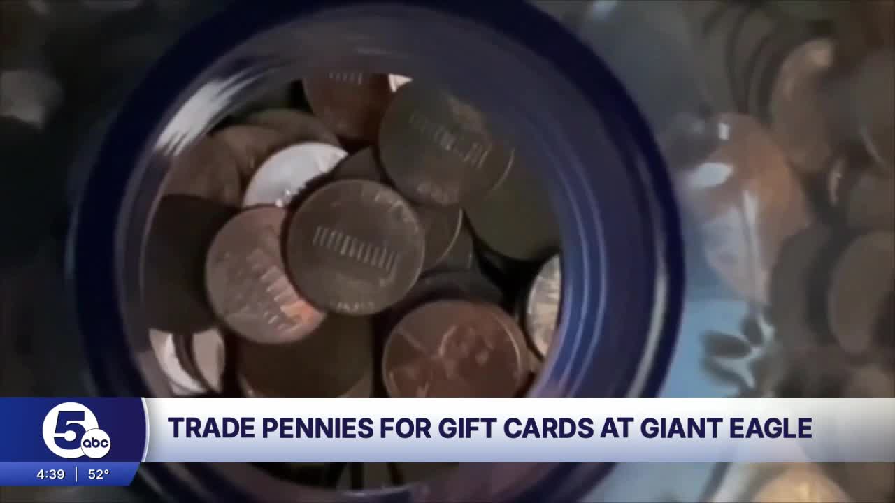 From 11 a.m. to 4 p.m., shoppers can bring in their spare pennies and exchange them for a Giant Eagle gift card worth twice the amount of the coins turned in. For example, 50 cents in pennies will earn a $1 gift card, while $100 in pennies will net a $200 gift card. The minimum exchange per transaction is 50 cents, with a $100 maximum.