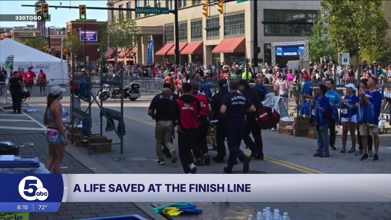 AKRON, Ohio — After a man collapsed at the Akron Marathon late Saturday morning, a good Samaritan, Akron firefighters and members of the Summa Health Medical Team stepped in to help save his life.