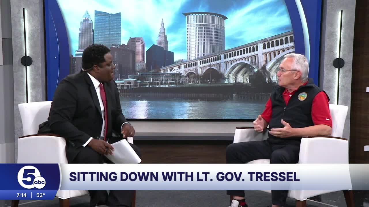CLEVELAND — Lt. Gov. Jim Tressel made the rounds in Northeast Ohio on Monday as registration opened for the next round of his Team Tressel Fitness Challenge. He sat down in the News 5 studio with anchor Damon Maloney, and their nearly 20-minute conversation covered a lot of hot topics beyond the fitness challenge, including Tressel’s political present and future. The following interview has been edited for clarity and length.