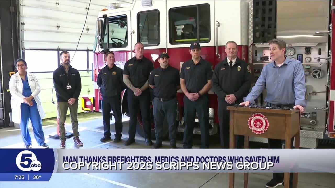 George Murphy, a man who was saved by Cleveland firefighters, paramedics and doctors at Metro Hospital after having a heart attack at a downtown restaurant in Cleveland, had a chance to say thank you on Wednesday.