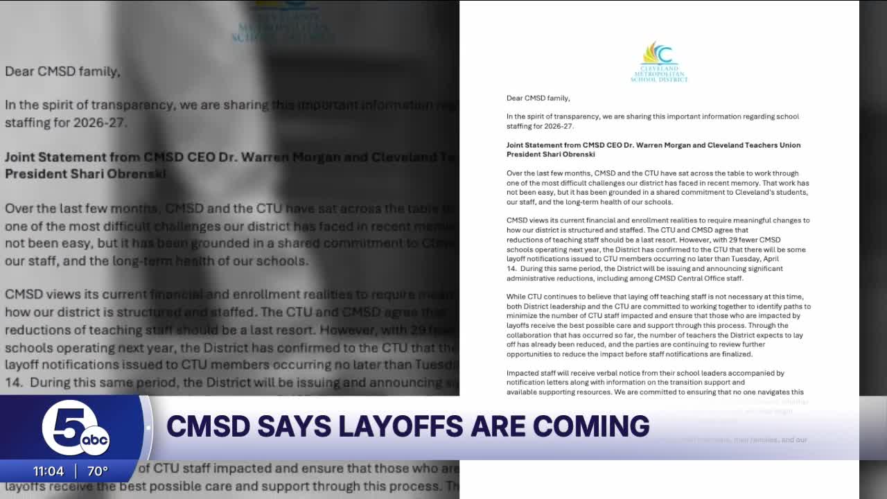 The district provided News 5 with a copy of the letter, which also said the district will be issuing and announcing significant administrative reductions, including among CMSD Central Office staff, during the same period.