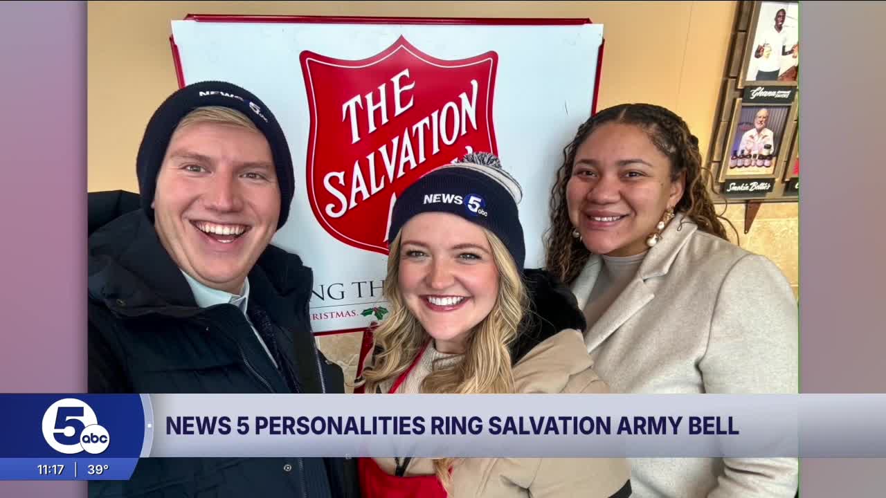 News 5 anchor Tessa DiTirro, meteorologist Allan Nosoff and reporter Maya Lockett rang out the bells at Giant Eagle in Solon on Saturday.