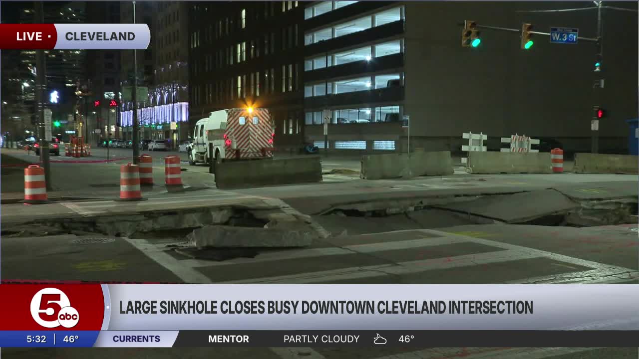 CLEVELAND — A large sinkhole has closed the intersection of West 3rd Street and West St. Clair Avenue in Downtown Cleveland.