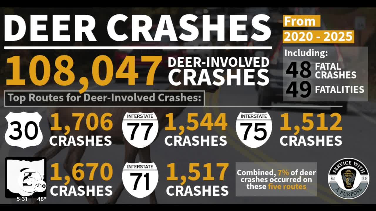 STARK COUNTY, Ohio — For the past five years, Stark County has led the state in deer-related crashes. Troopers with the Ohio State Highway Patrol tell News 5 it's no surprise. Busy routes like I-77 and U.S. 30 cut right through areas where deer are constantly on the move