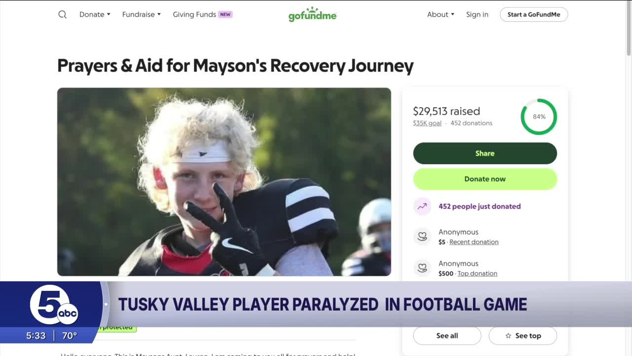 ZOARVILLE, Ohio — A Tuscarawas Valley High School freshman football player was left paralyzed Friday after making a tackle during a game, according to the Tuscarawas Valley Local School District.