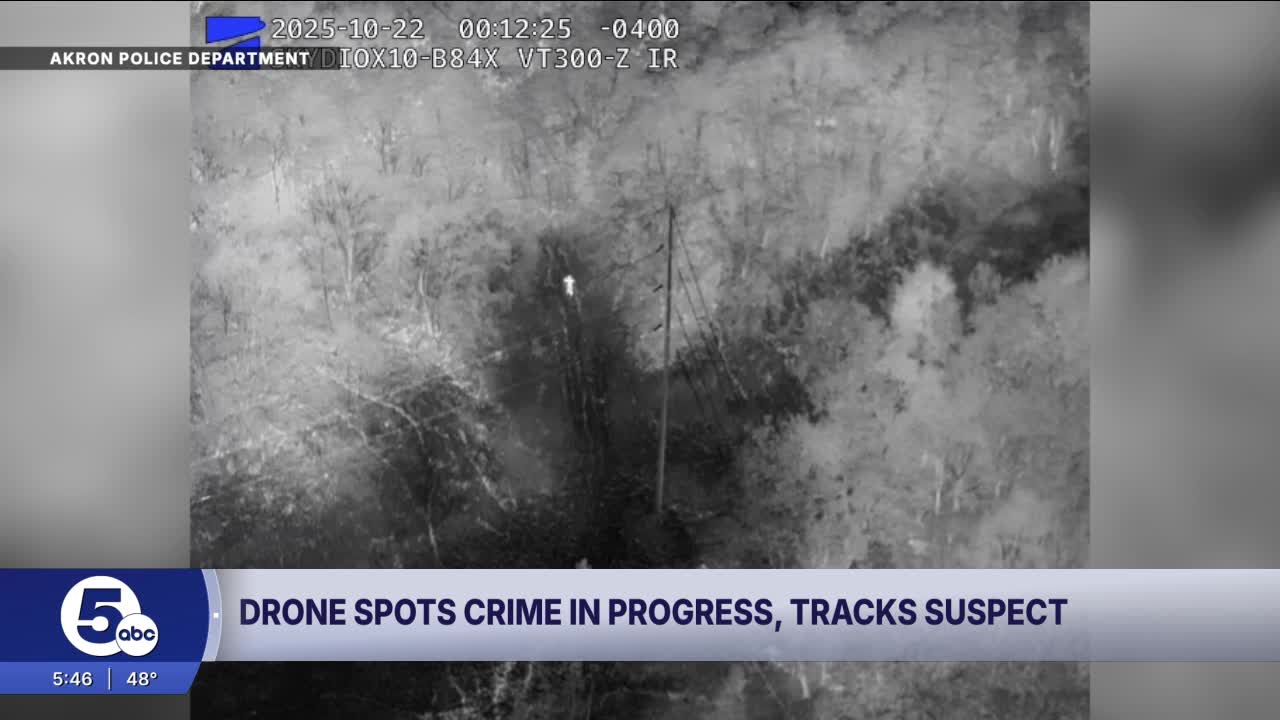 AKRON, Ohio — A police officer's hunch to launch a drone at just the right moment captured a suspected crime in real time, leading to a foot chase and the arrests of two suspects.