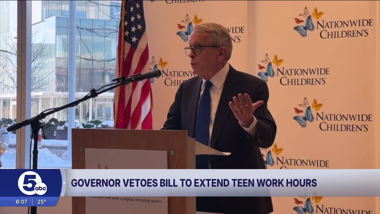 COLUMBUS, Ohio — Ohio Republican Gov. Mike DeWine has vetoed a bill that would have loosened child labor laws, allowing 14- and 15-year-olds to work until 9 p.m.