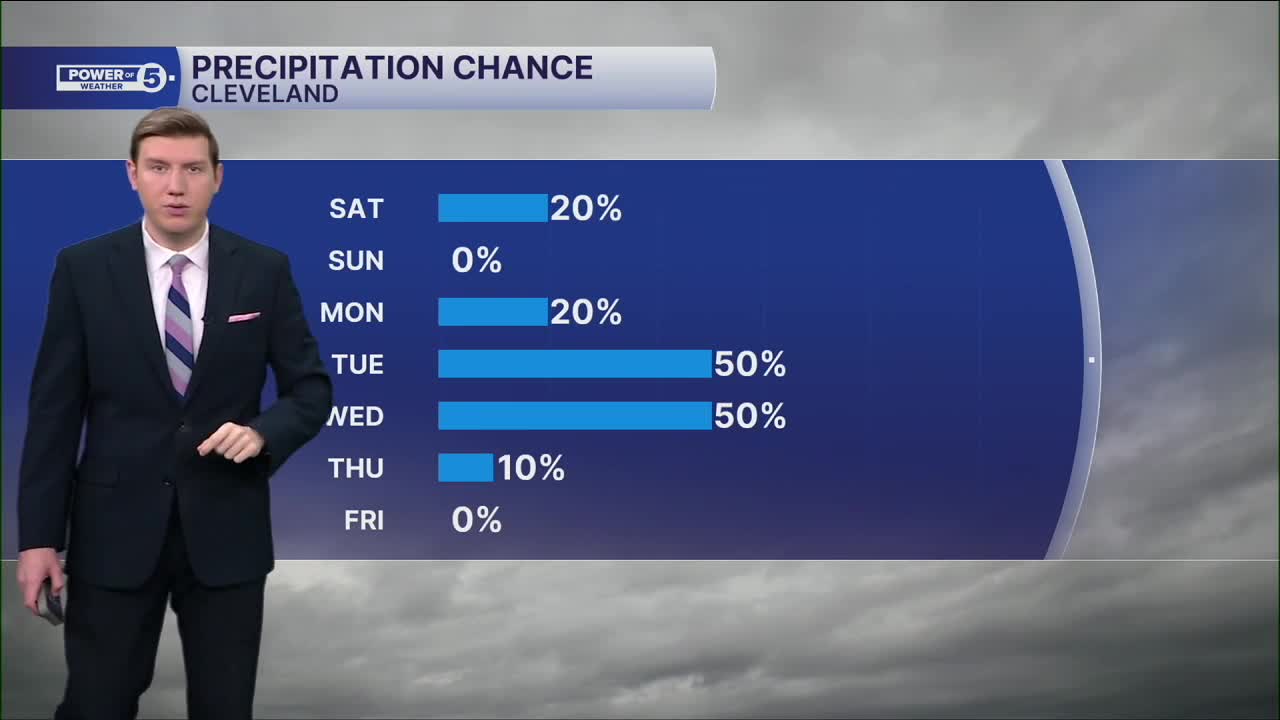 CLEVELAND — Say goodbye to summer weather this weekend. A cold front has crossed Northern Ohio early Saturday morning, with a few leftover showers S&E of Akron. Behind the cold front, some patchy dense fog has moved in from Lake Erie, and expect it to linger through midday.