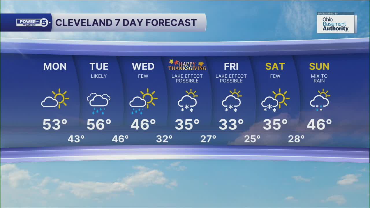 CLEVELAND — The work week will begin dry, but this will not last long, as Tuesday is expected to see potentially heavy rain. A large storm, spanning over a dozen states, will bring rain on Tuesday, with some lingering showers through Wednesday. The storm will then pull significantly colder air by Thanksgiving and Black Friday.