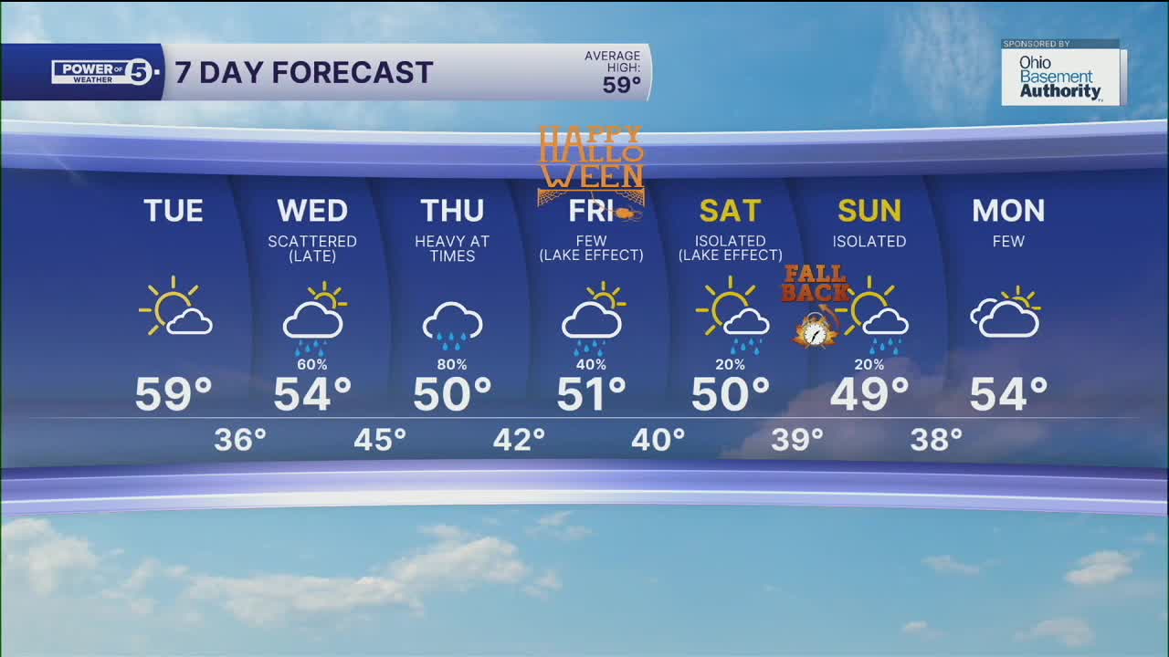 We will be sure to keep you posted on the latest trends and potential lake-effect precipitation after the storm on Halloween, so be sure to check back or tune in. As of Monday night, plan for light, although pesky showers and chilly temperatures for Halloween. The highs on Friday look to only be in the low 50s. That means by the time all the witches and ghosts are out trick-or-treating, it will be even cooler.