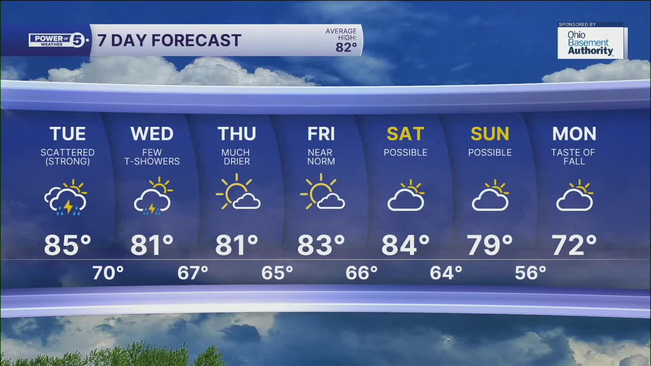 Our next cold front is heading our way on Tuesday. Plan on a stray t-storms in the morning, but the better chance for rain and storms will hold off until the late afternoon and evening. We are expecting a line of rain and thunder sliding east into Ohio from about noon until midnight. The highest coverage of storms will likely be from about 4 pm to 10 pm, with storms gradually fading as we near midnight. The strongest storms will have lightning, heavy rain, and gusty winds. The threat of damage is low but not zero. Make sure you have a way to get updates as these storms roll through NEO.