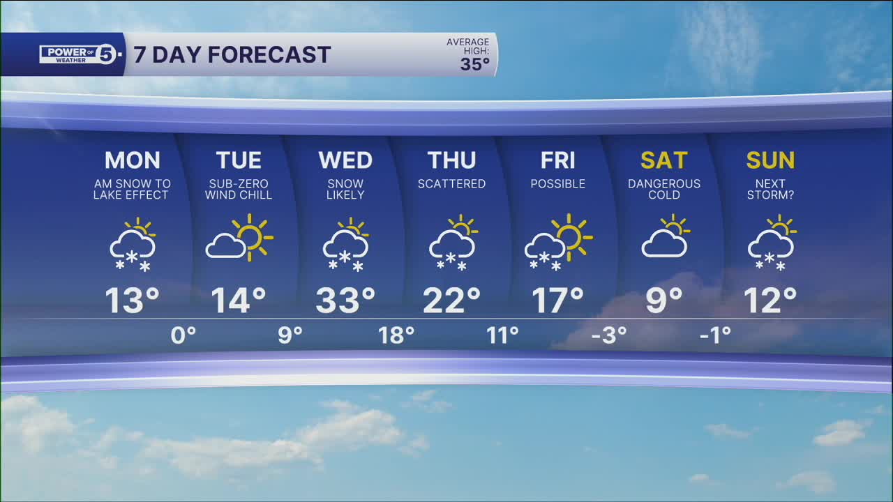 CLEVELAND — Scattered snow showers will impact the morning commute with slick spots and coatings on untreated surfaces. The wind is starting to pick up, so these powdery, fine flakes will make visibility less than ideal. It already feels like single digits and will feel like below zero this afternoon as a Cold Weather Advisory goes into effect. It will feel like 15 to 20 below zero tonight.