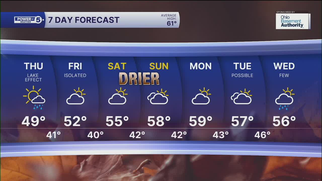 CLEVELAND — Here's our first big battle with the Lake Effect "Rain" Machine! The water temperature in Lake Erie is still holding in the lower 60s. That's mild compared to the air blowing over the water and into Ohio. We were stuck in the 40s all day yesterday and will be again today. That means TONS of moisture will get pulled out of the lake, lofted into the sky, and dropped on Ohio.