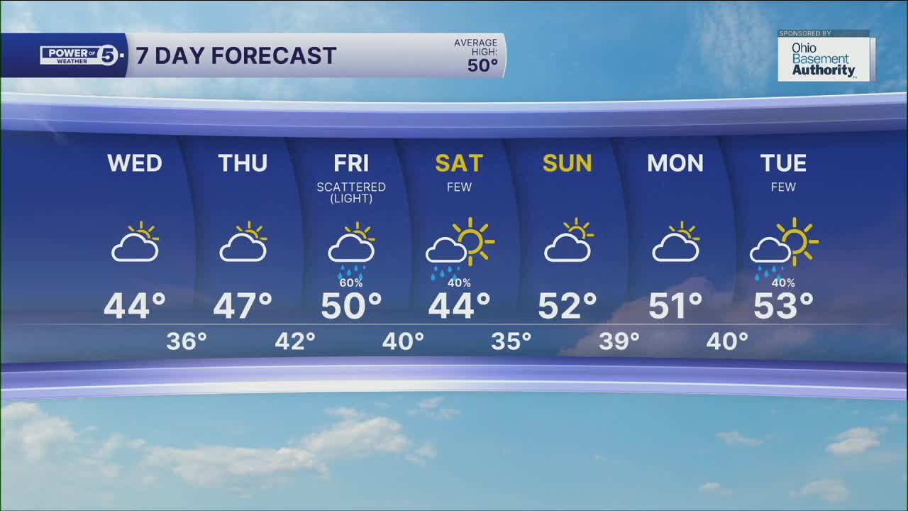 Temperatures will bump a few degrees for the end of the week, with highs in the lower 50s by Friday. Rain chances begin to return with the warmer air, with the best chances to the south of Greater Cleveland on Friday and early Saturday.