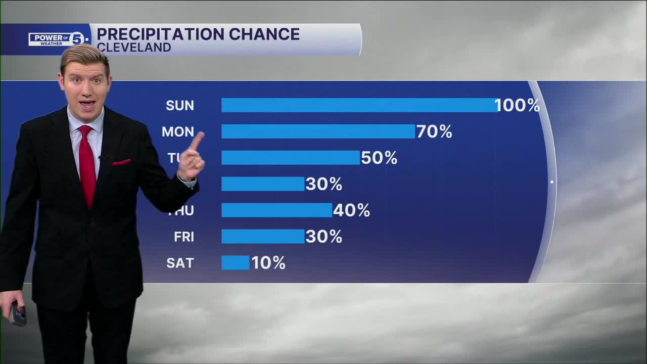 The initial burst of heavy rain has crossed Northeast Ohio and warmer air is surging in for the afternoon and especially evening. Temperatures will then soar into the 50s and 60s by late Sunday afternoon, along with increasing wind. Most of the heavy rain will likely stay north over the lake, but occasional isolated downpours are possible the rest of the day, especially north of Akron, which means some rain is likely for the Browns game, while missing out on the worst of this part of the storm.