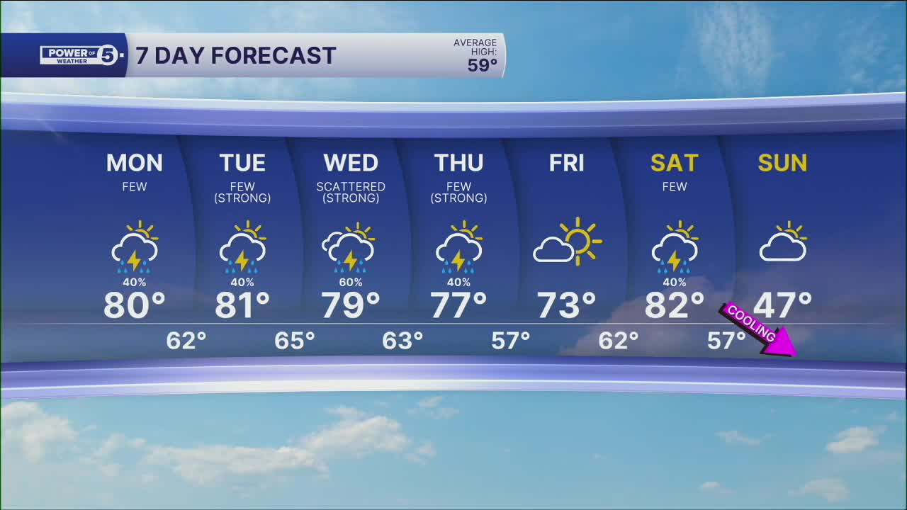 Tuesday: A few storms. Humid.| High: 81°