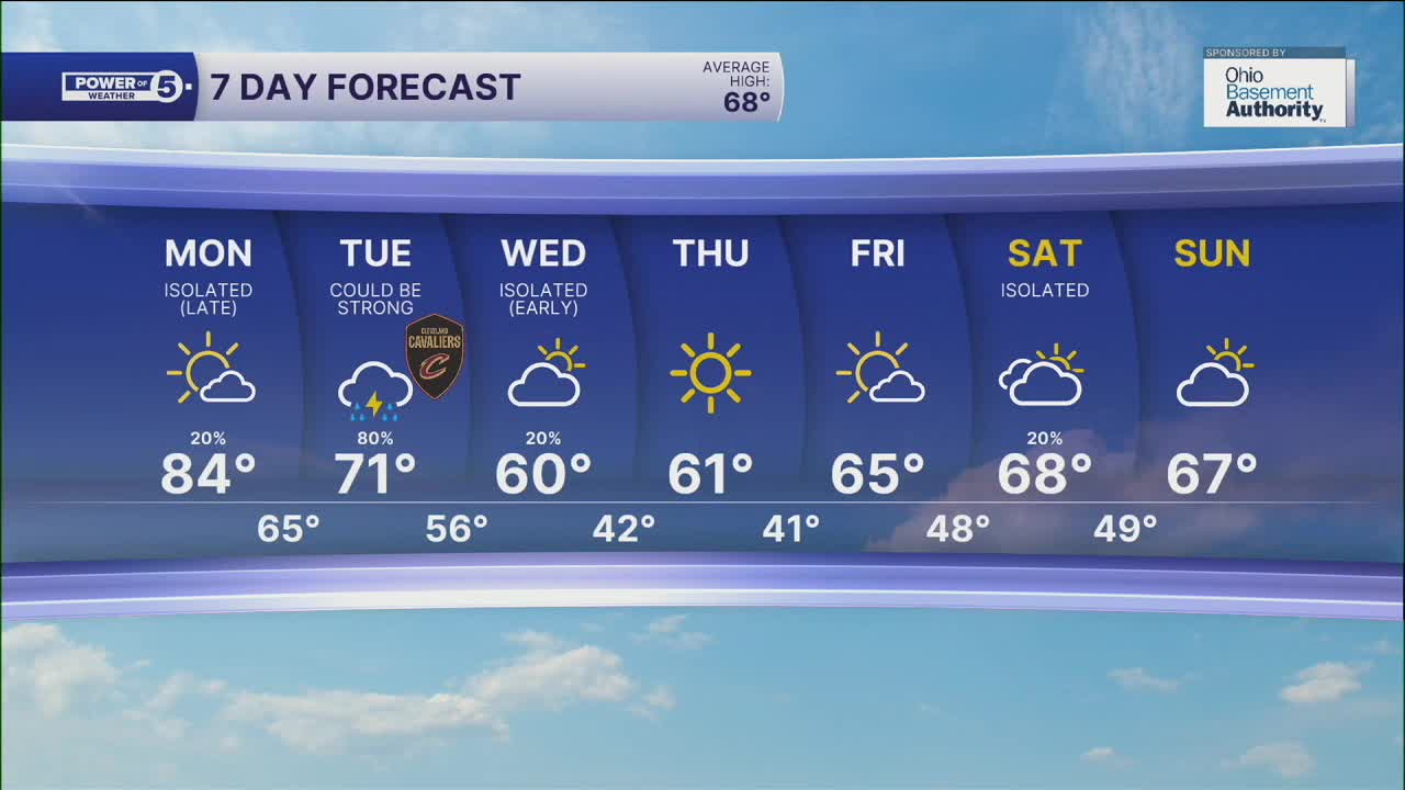 Our stretch of dry days will come to an end on Tuesday, and so will the late-season heat. A stray pop-up shower can't be ruled out on Monday evening, mainly south and west of Akron, but widespread showers are expected to wait until Tuesday during the morning commute. Plan on scattered rain on Tuesday with some isolated strong-to-severe thunderstorms. Rain and or storms could produce heavy rain at times, with some minor flooding possible. Behind the front on Wednesday, expect drier and much cooler air to round out the workweek. We actually look to fall BELOW average by then! Highs will struggle to reach the low 60s on Wednesday afternoon and fall to near 40 degrees Thursday morning, with 30s inland. Some patchy frost will be possible across our inland communities for the first time this season!