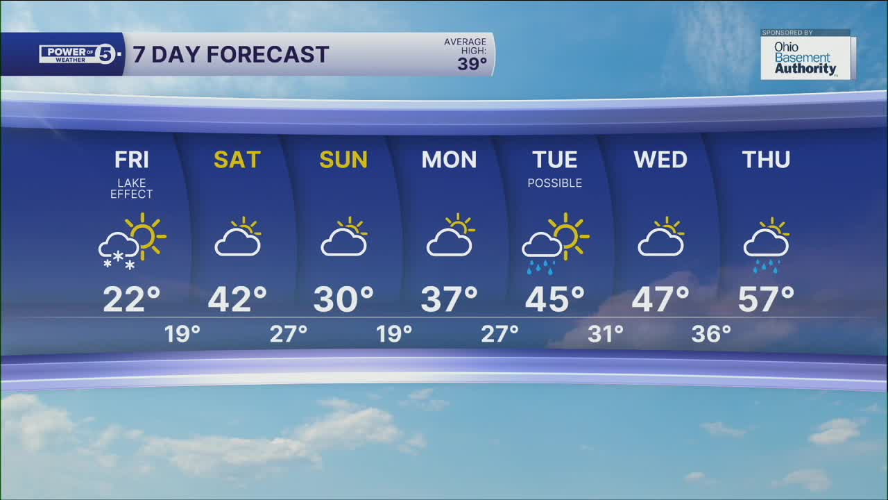 The lake effect snow showers taper off around midnight, and lows dip to the upper teens but feel like single digits. It is a short-lived cold blast as another (albeit tamer) warm surge arrives tomorrow with highs back into the 40s.