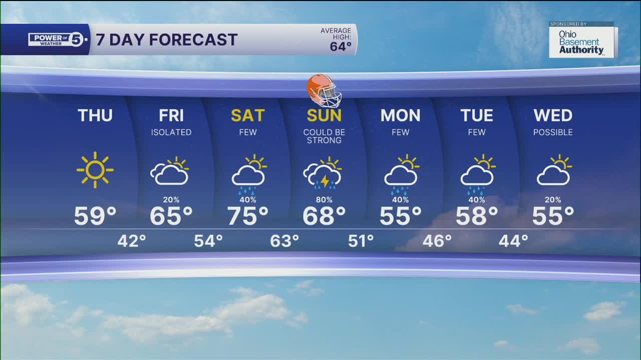 The cold front will move through the region by mid to late afternoon on Sunday, so rain and even storms could impact the Browns game on Sunday afternoon. Wind gusts of 40 to 50 mph will be possible as the front moves through. Cooler air will filter in for the start of the new work week behind the front, as highs drop into the mid 50s, along with a few lingering rain chances on Monday.