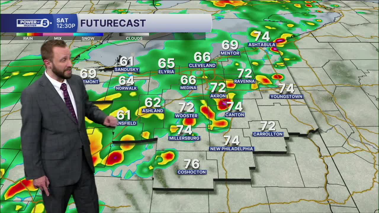 CLEVELAND — Better rain chances return Saturday with a severe storm threat. Temperatures will continue to be well above average, with low 70s on Saturday before the storms arrive. Storms will begin to move in for the second half of the morning into the afternoon from west to east. A few storms could contain large hail, damaging winds and or an isolated tornado, especially east of I-71. Heavy rain will also be a concern, but that will be a more scattered issue for the region.