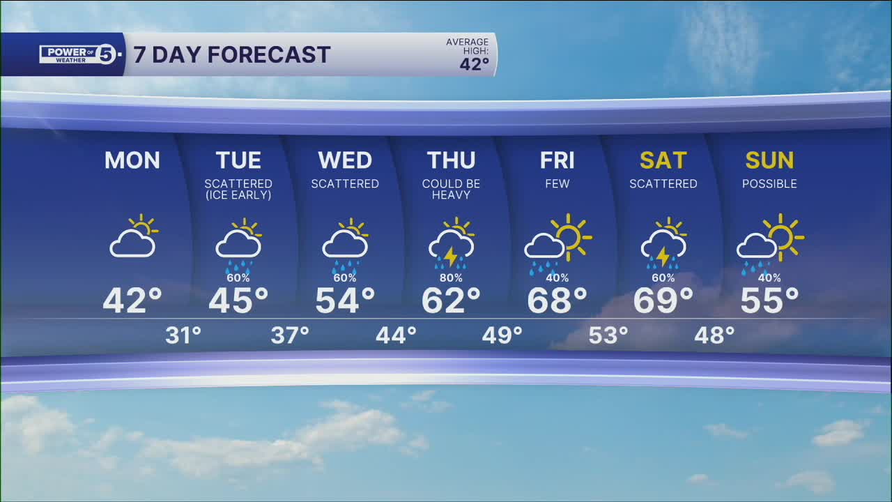 Things change the rest of the week. We're building toward a warmer and much wetter week. Today, 40s. We'll see 50's by midweek with 60s and possibly 70s late week.