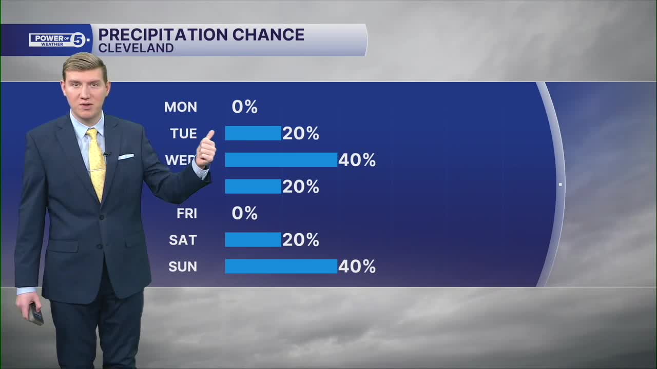 Those clouds are in advance of the chill coming back. Winds shift, and temps take a dive midweek. We're back subfreezing with lake effect snow Wednesday through early Thursday with a couple of inches possible, mainly in the primary snowbelt.