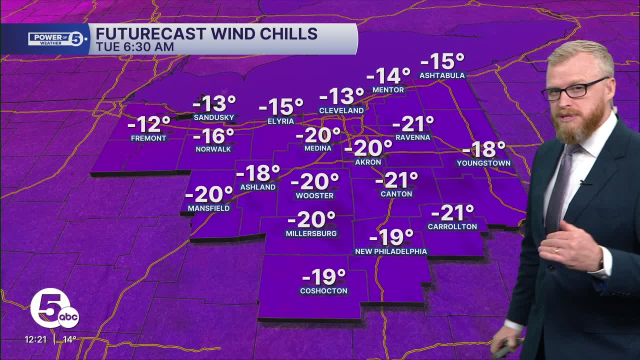 CLEVELAND — The extreme cold is moving in overnight, with a brief break in the snow. Dangerous cold will be around all day Tuesday, with another opportunity for more accumulating snow.