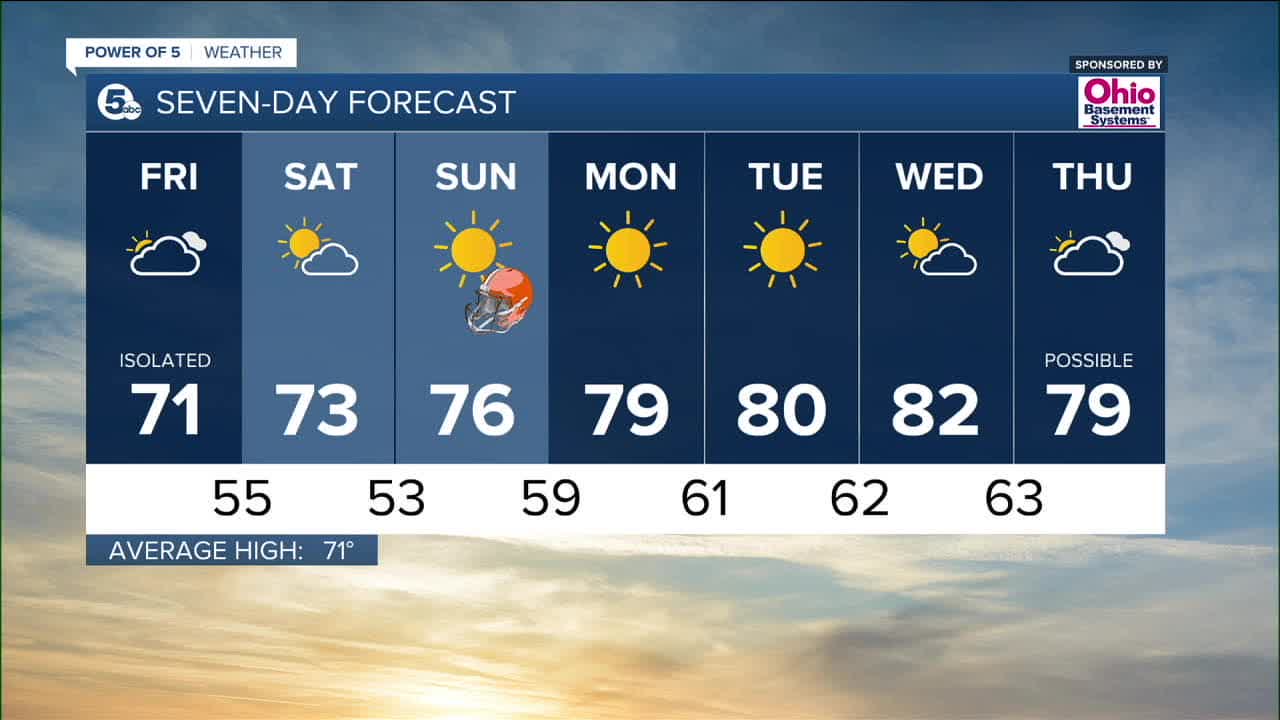 CLEVELAND — Skies will begin to clear out during the day on Friday. Temps jump into the lower and middle 70s by the late afternoon hours. High temperatures Saturday and Sunday should fall into the 75 to 80 degrees range with abundant sunshine each day. Weather for the Browns game Sunday looks Sunday warm and dry! High will approach 80 through most of next week! Summer trying to hang on in NE OH!