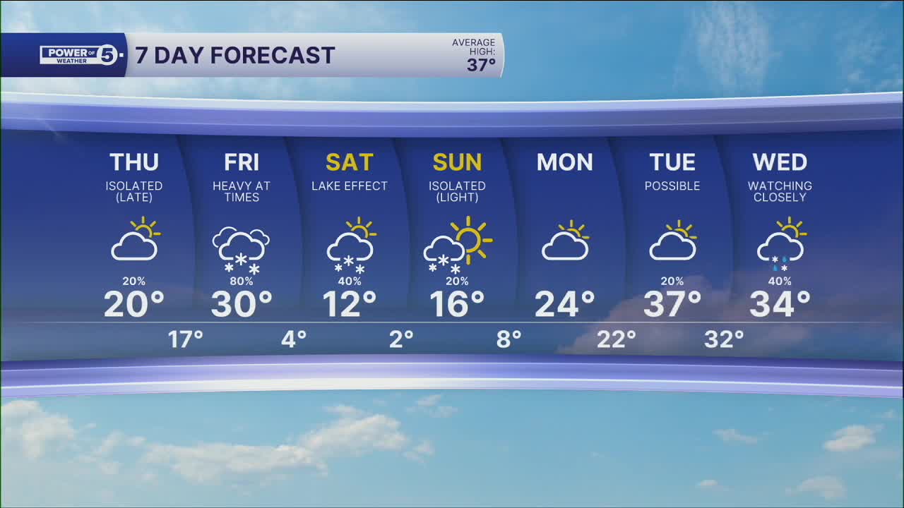 Clouds taking over will really limit the rebound. Frigid temperatures across Northeast Ohio once again, with highs in the upper teens and lower 20s on Thursday afternoon. We're warmer on Friday but also wetter. I'm talking snow.