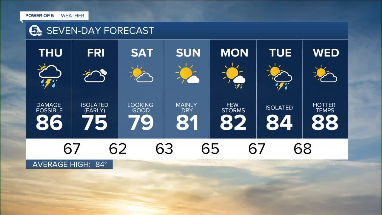 A warm front will move north into the area Thursday morning bringing with it higher humidity through the day. Look for muggy highs in the middle 80s. The Storm Prediction Center in Norman, Oklahoma has placed all of Northern Ohio in a slight risk for severe thunderstorms late afternoon into Thursday night. Isolated damaging wind gusts, large hail an even a brief tornado are possible is severe storms do materialize.