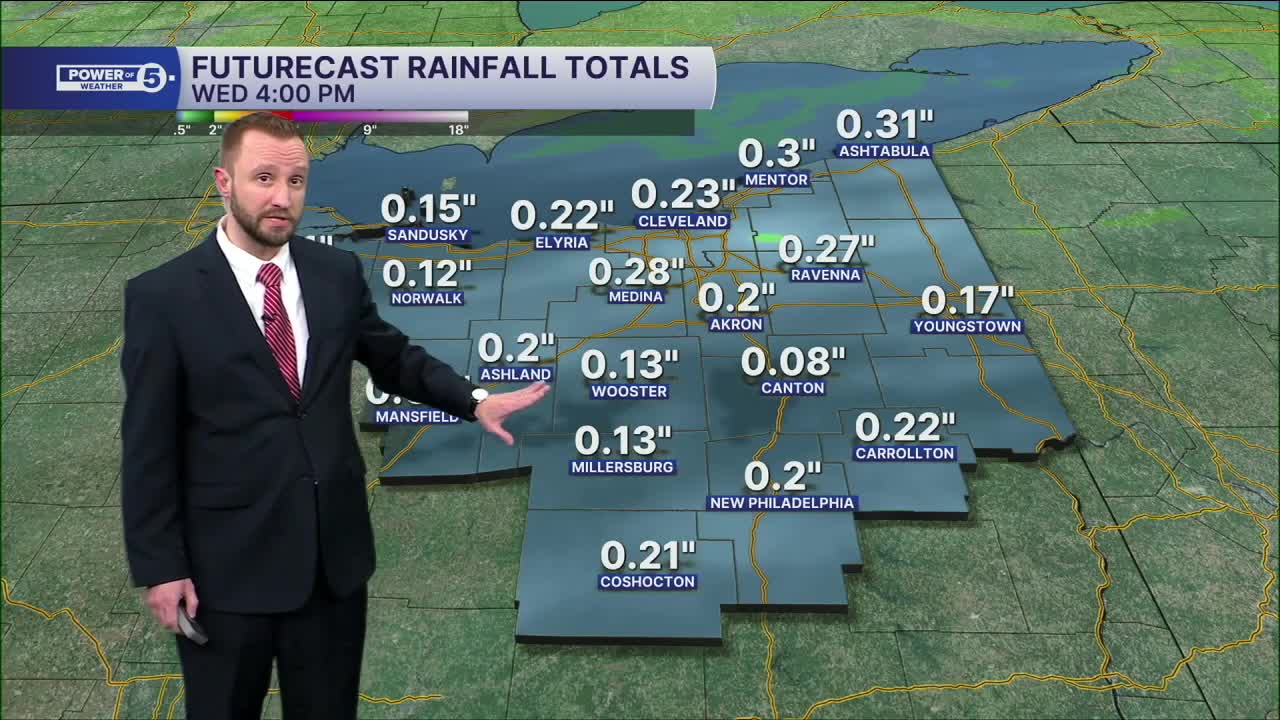 CLEVELAND — Rain will become more widespread ahead of a cold front by mid-morning on Wednesday, and will begin to taper off during the early afternoon. Isolated thunder will be possible during the morning on Wednesday. Rain totals of up to a quarter inch will be possible across the region from Tuesday night into the early afternoon on Wednesday.