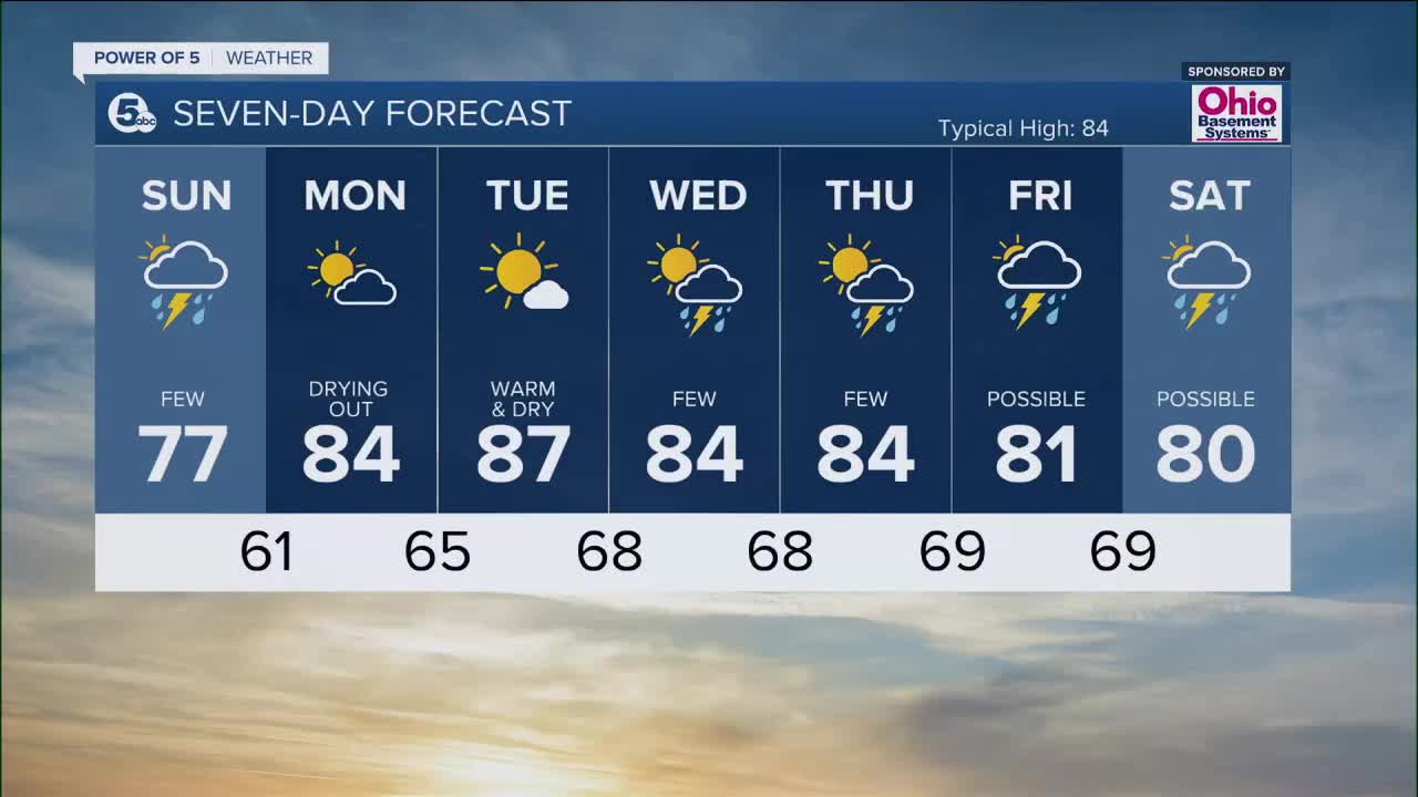 CLEVELAND — An isolated t'shower will be possible during the overnight, with otherwise warm and muggy conditions. Rain chances will return on Sunday. The best chance for rain on Sunday will be predominately in our eastern communities during the morning, with a drying trend expected through the afternoon into the evening. An isolated strong to severe storm will be possible, with heavy rain and a stronger gust the primary concern. Temperatures will be cooler than average, as highs top off in the upper 70s Sunday.