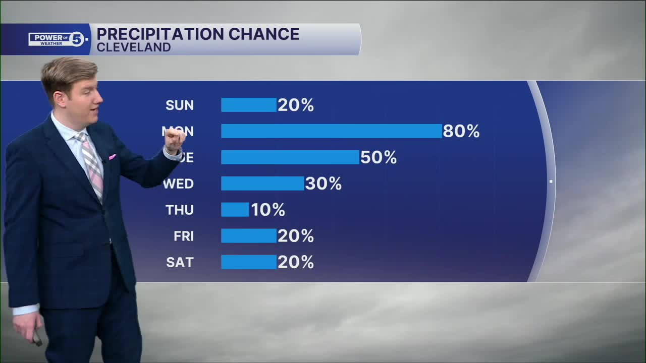 CLEVELAND — Any leftover morning showers quickly exit by 10 a.m., and a warm wind will take over for the rest of the day. A Wind Advisory will go into effect for areas north of I-76, including Cleveland, towards the Snowbelt from 2 p.m. Sunday until 8 a.m. Monday. Southerly winds of 20 to 30 mph, along with gusts up to 50 mph, will make travel tricky and increase power outages due to compromised infrastructure.