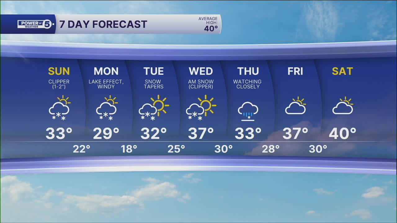 CLEVELAND — Winter is here, again! Or should I say it never left? Either way, snow showers will continue for most of the day, mostly on the light-to-steady side. Accumulations of an inch or two are expected for most. Then, the lake effect arrives.