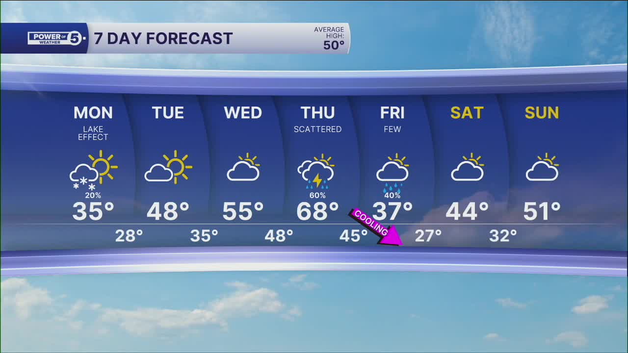 Even with a shot at lake effect snow showers. These will set up this morning and linger into the afternoon. Even coatings on colder surfaces can't be ruled out through sunset as some of the snow showers could pack a brief punch. It's not a one-hit wonder of cold either. We rebound midweek but late week it comes right back!