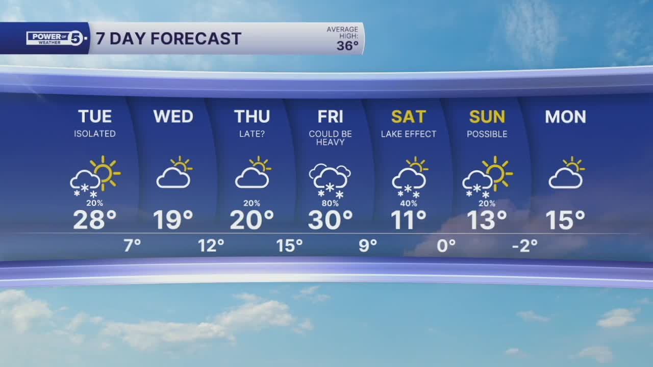 Tuesday: Isolated snow showers possible with a snow squall or two late. | High: 28º