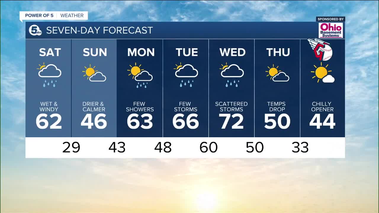 We will see more rain and storm potential on Wednesday, before we dry and cool back down. Opening Day for the Guardians is looking dry and chilly, as highs climb into the mid to upper 40s!