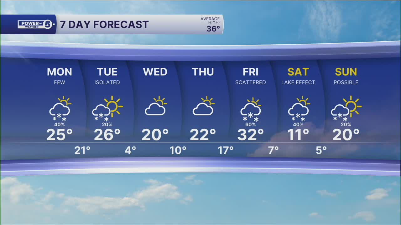 Monday: Few snow showers late, cold. | High: 25º