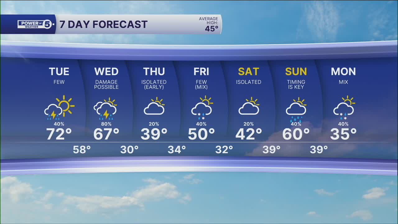 Wednesday: Severe storms possible. Rapidly dropping temps late. | High: 65º