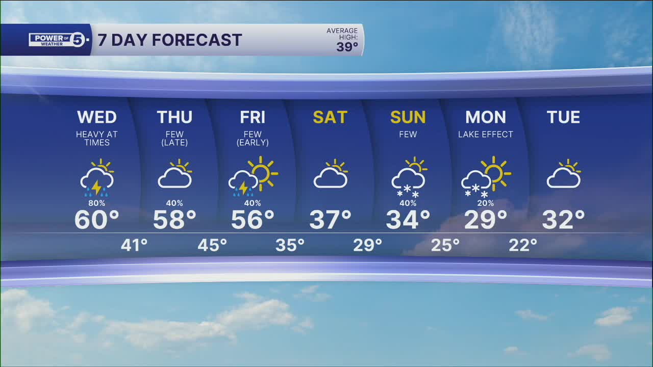 Wednesday: Scattered rain with thunder possible, windy. | High: 60º