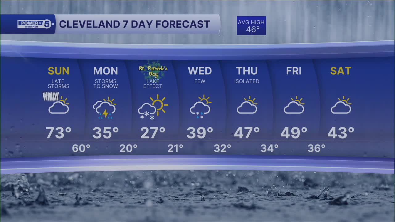 CLEVELAND — A few stray rain or snow showers can't be ruled out late this evening, with the better shot after midnight, with temperatures in the mid to upper 30s for most tonight. Temperatures will surge on Sunday. We'll go from the 30s pre-dawn Sunday to the 70s by the afternoon. Gusty winds will return with the warmth (but not as strong as Friday).
