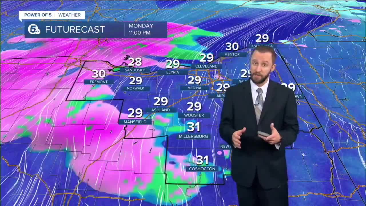 Warm air and rain showers are moving our way for this week. But a lingering layer of surface cold air could cause an icy morning commute for motorists on Tuesday. Freezing rain will arrive after midnight tonight across much of Northern Ohio. Ice accumulations of .1" to .2" are possible by noon on Tuesday. Sleet and some snow could also mix in through the early afternoon. Morning temperatures will range between 28 and 31 degrees across the area. Those temperatures should rise into the middle-upper 30s by mid to late afternoon, ending the threat of ice. Scattered rain showers are possible during the afternoon hours as well.