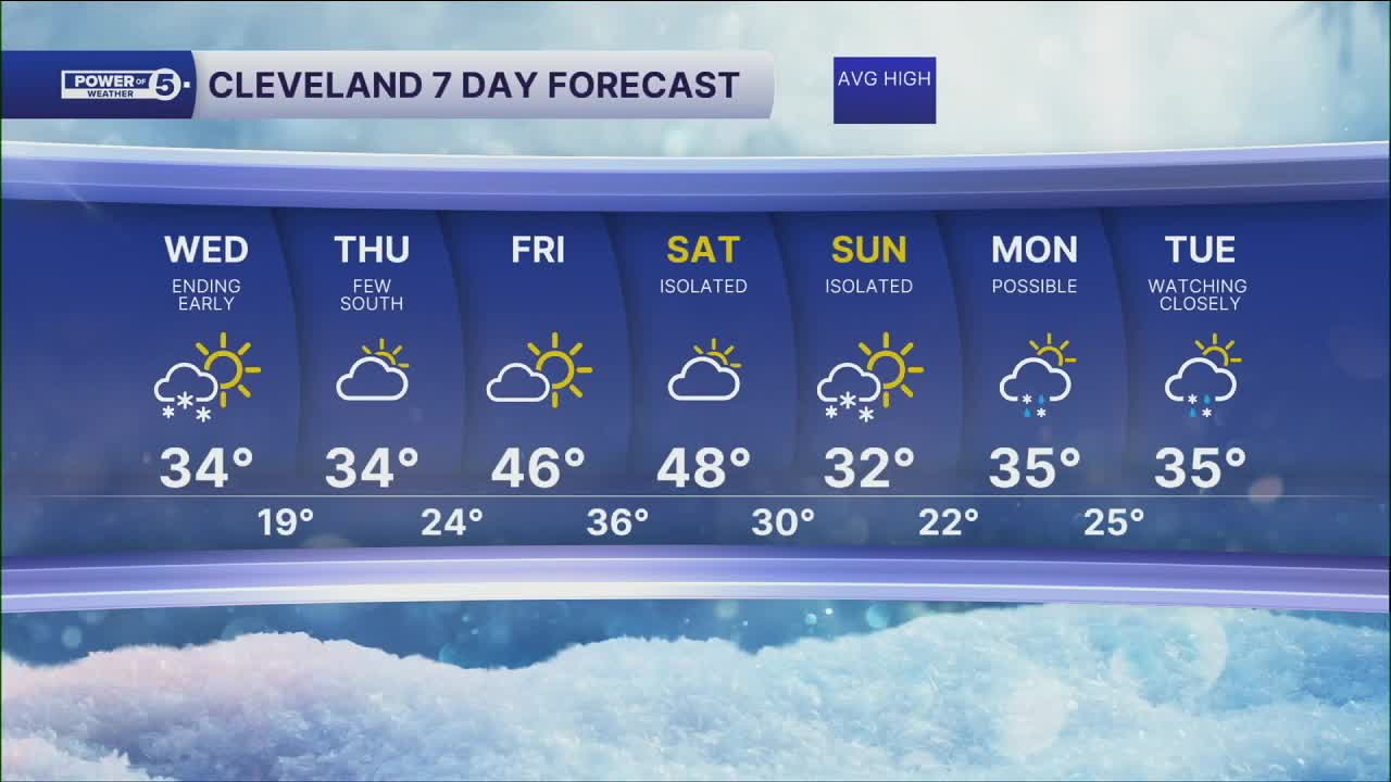 CLEVELAND — Our next shot at snow rolls in tonight. It's a quick-moving Albert Clipper. Temps will be holding near 32º, so plan on a slush trace up to 2" of snow, with highest totals in the snowbelt region. Most of the snow will linger into the wee hours of Wednesday morning. The good news is that the snow moves out by sunrise, but we'll still have to clean the cars off. Make sure you allow time for that as we start our Wednesday.