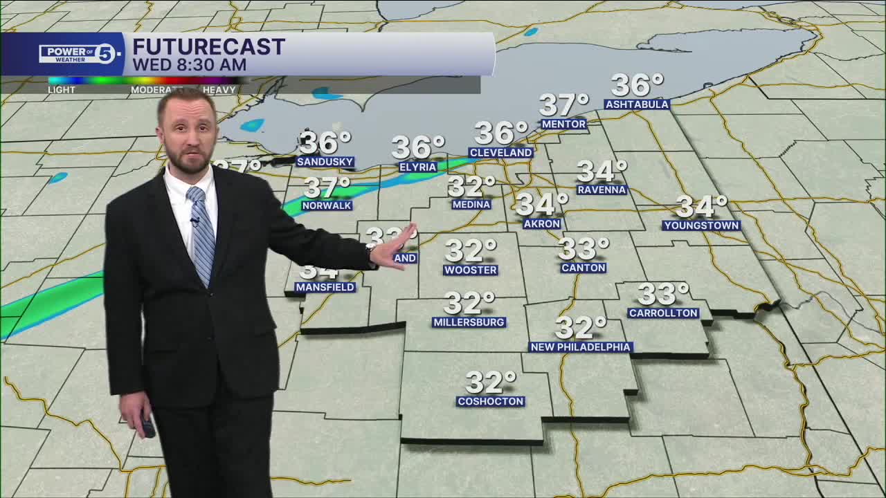 CLEVELAND — A weak front will move through early on Wednesday, and may squeak out a rain drop and or snowflake, but most of the region is looking dry.