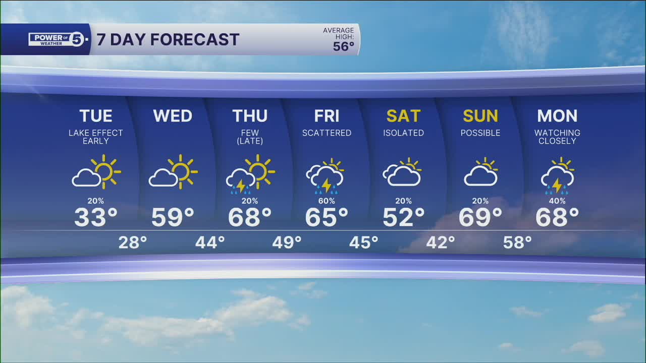 Temperatures have dipped into the 20s. That cold air pushing over a warming Lake Erie means lake effect snow. Plan on brief bursts of snow in isolated areas with little accumulation expected, mainly on elevated areas. Lake effect snow will begin to taper off by midday.