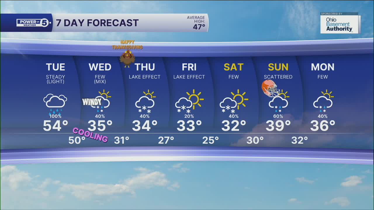 Plan on heavy snow in squalls east of CLE and into the primary snowbelt on Thanksgiving and Black Friday. This will impact travel over the holiday. Not only is snow expected, but it will also be windy. This could cause blowing and drifting snow, plus brutal wind chills!