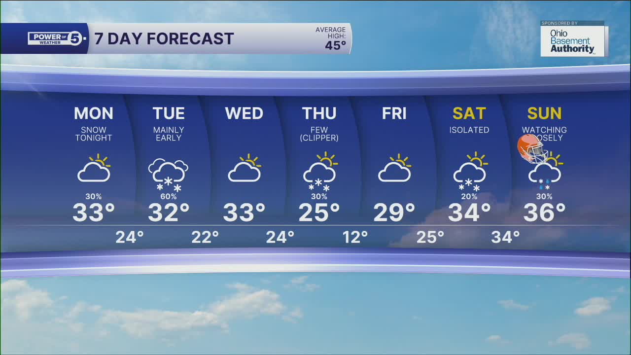 Monday: Cloudy & Cold. Isolated morning lake-effect snow. Steady snow arrives after 9 p.m..| High: 33º