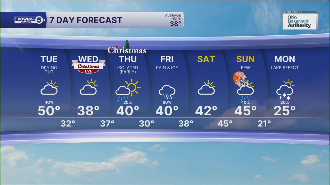 Chilly air comes back for Christmas Eve and Christmas Day. Highs in the upper 30s to around 40 on Christmas Eve and well into the 40s on Christmas Day.