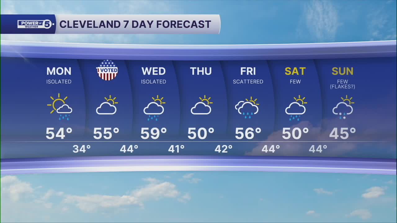 CLEVELAND — Isolated light showers are possible as the cold front rolls through early this afternoon. Once the front passes, the rest of the day will be dry with similar, seasonable temperatures in the mid to upper 50s. The front will also kick up our winds on Monday. Plan for westerly winds to increase from 5 to 10 mph to 15 to 25 mph by the afternoon.